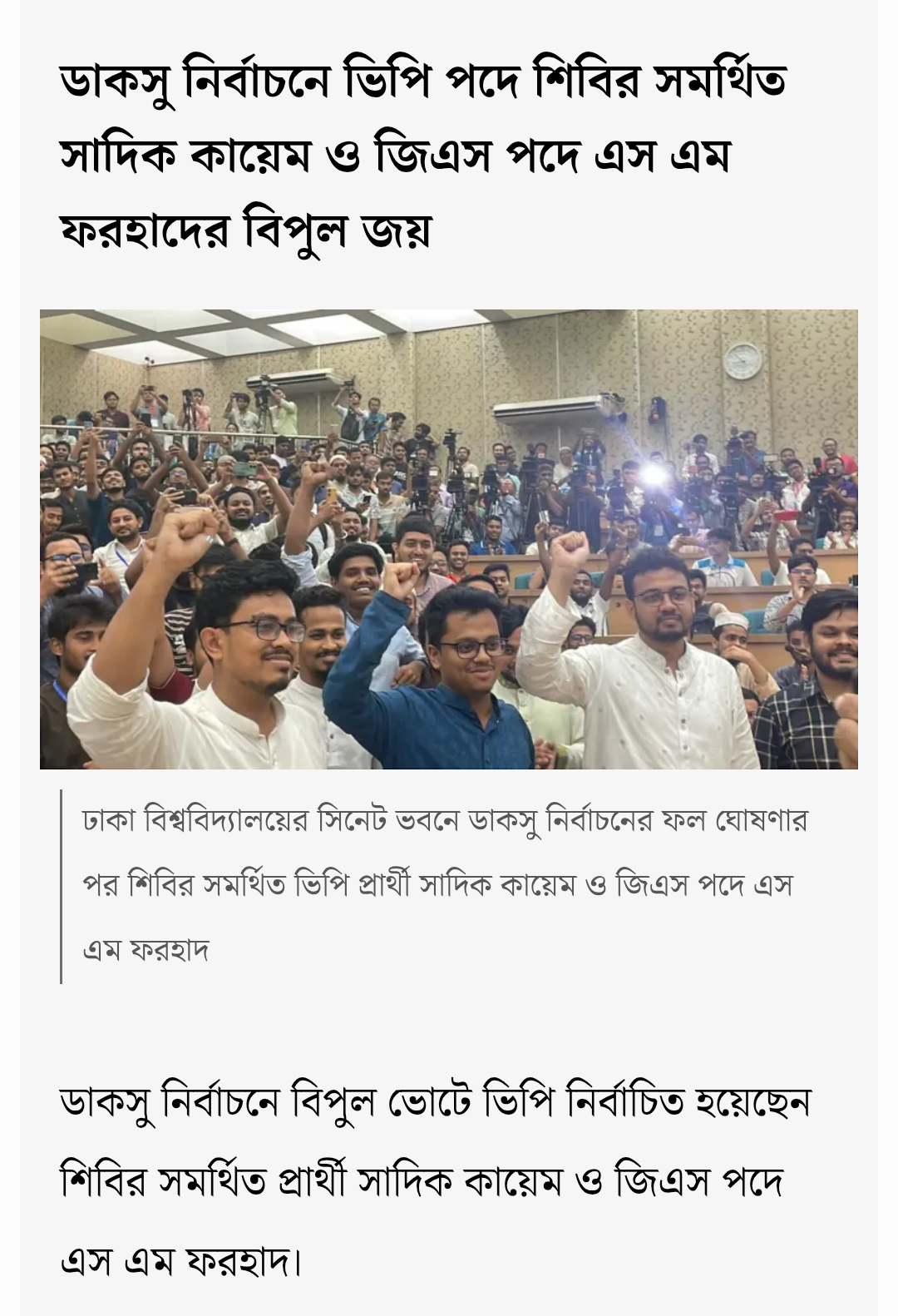 রাজশাহী বিশ্ববিদ্যালয় কেন্দ্রীয় ছাত্র সংসদ (রাকসু) নির্বাচনে ছাত্রশিবির–সমর্থিত ‘সম্মিলিত শিক্ষার্থী জোট’ প্যানেলের ভিপি প্রার্থী মোস্তাকুর রহমান (জাহিদ) ও জিএস (সাধারণ সম্পাদক) পদে ‘আধিপত্যবিরোধী ঐক্য’ প্যানেলের সালাউদ্দিন আম্মার জয়ী হয়েছেন।