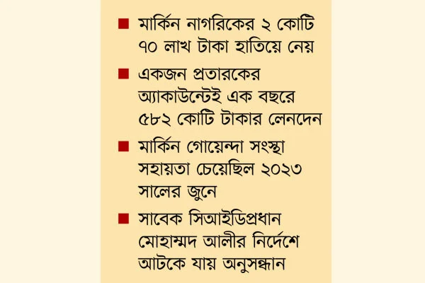 আর একজনের অ্যাকাউন্টেই লেনদেন হয়েছে ৫৮২ কোটি টাকা। তবে অবাক করা তথ্য হলো- ২০২৩ সালে মার্কিন গোয়েন্দা সংস্থা বাংলাদেশের কাছে এই বিষয়ে সহায়তা চাইলেও তৎকালীন সিআইডি প্রধানের হস্তক্ষেপে থেমে যায় এর অনুসন্ধান।