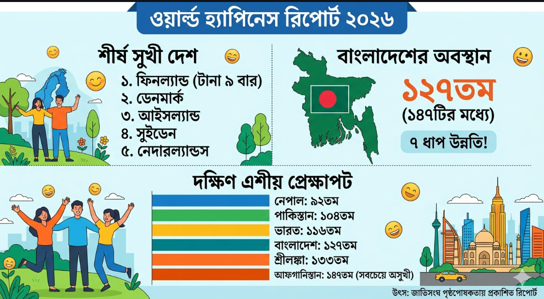 জাতিসংঘের পৃষ্ঠপোষকতায় প্রকাশিত ‘ওয়ার্ল্ড হ্যাপিনেস রিপোর্ট ২০২৬’-এ আবারও বিশ্বের সবচেয়ে সুখী দেশের মুকুট ধরে রেখেছে উত্তর ইউরোপের দেশ ফিনল্যান্ড। এ নিয়ে টানা নবমবারের মতো তালিকায় শীর্ষস্থান দখল করল দেশটি। অন্যদিকে, বিগত বছরগুলোর তুলনায় এবারের সূচকে কিছুটা উন্নতি হয়েছে বাংলাদেশের। ১৪৭টি দেশের মধ্যে বাংলাদেশ এবার ১২৭তম অবস্থানে উঠে এসেছে।